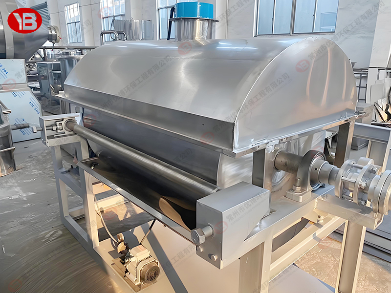 3、啟動(dòng)電機(jī),主滾筒動(dòng)運(yùn)轉(zhuǎn)平穩(wěn),溫度升高后加入物料后調(diào)整電機(jī)轉(zhuǎn)速及物料在滾筒上薄膜均勻程度來控制物料終含水量。