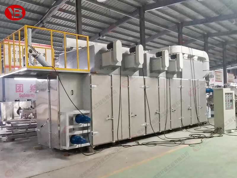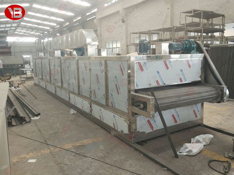 物料由加料器均勻地鋪在網(wǎng)帶上,網(wǎng)帶采用12-60目不銹鋼絲網(wǎng)。由傳動裝置拖動在干燥機內(nèi)移動。干燥機由若干單元組成,每一單元熱風(fēng)獨立循環(huán),部分尾氣由專門排濕風(fēng)機排出,廢氣由調(diào)節(jié)閥控制,熱氣由下往上或由上往下穿過鋪在網(wǎng)帶上的物料,加熱干燥并帶走水分。網(wǎng)帶緩慢移動,運行速度可根據(jù)物料溫度自由調(diào)節(jié),干燥后的成品連續(xù)落入收料器中。上下循環(huán)單元根據(jù)用戶需要可靈活配備,單元數(shù)量可根據(jù)需要選取。