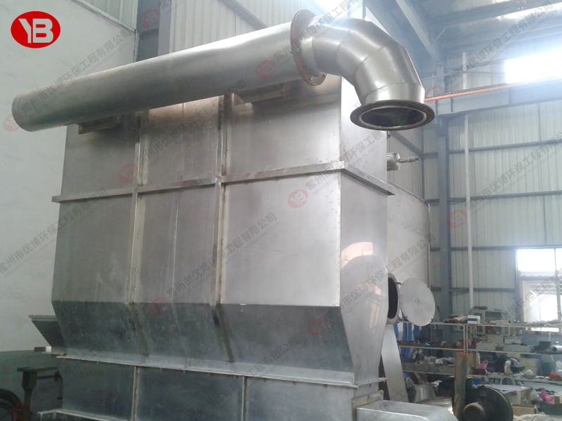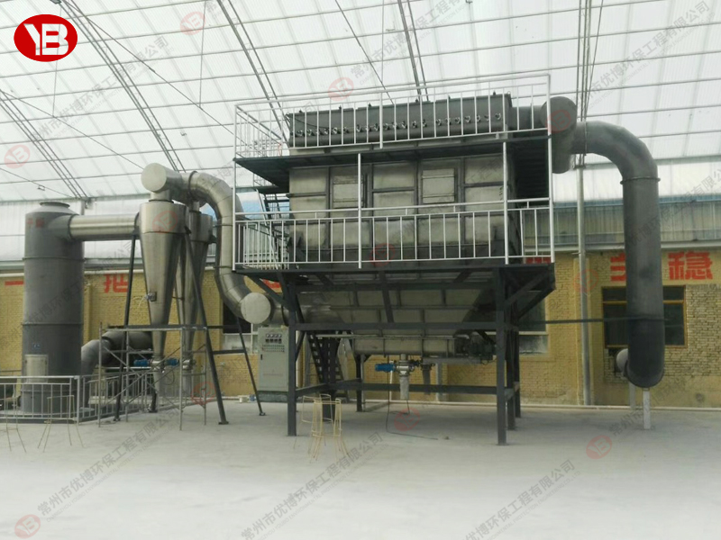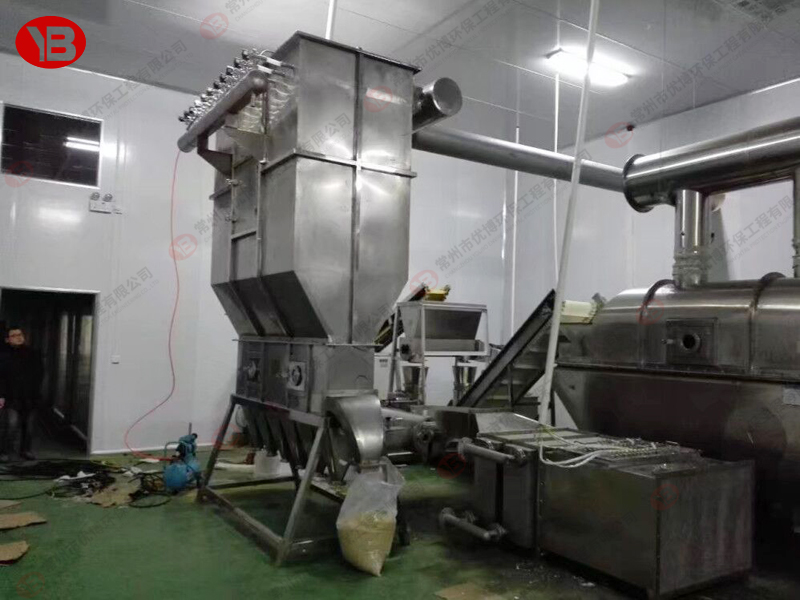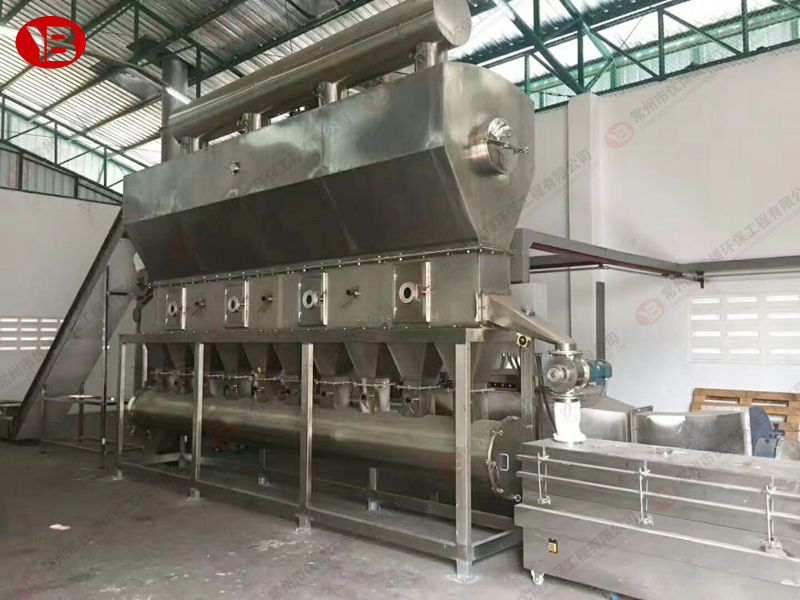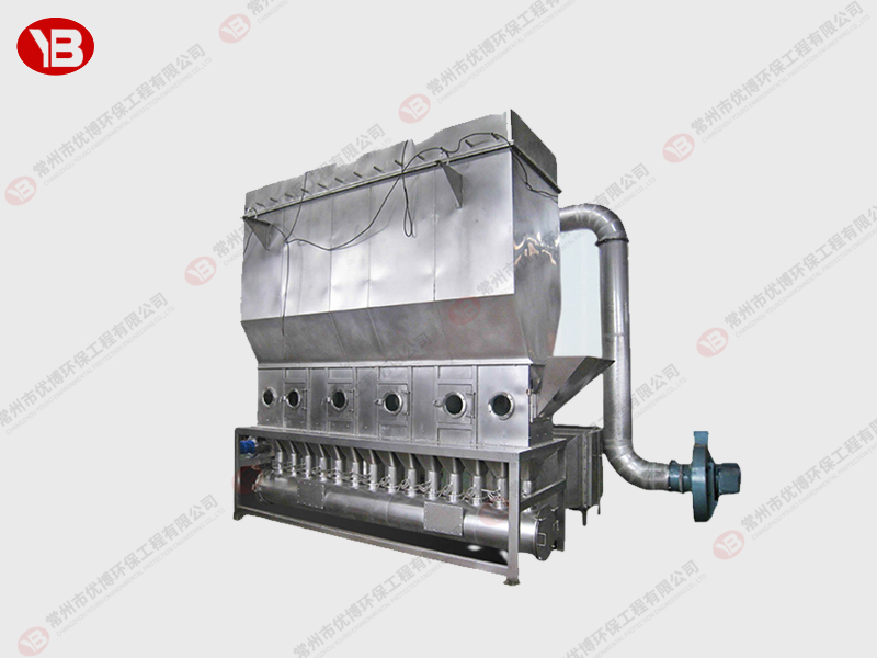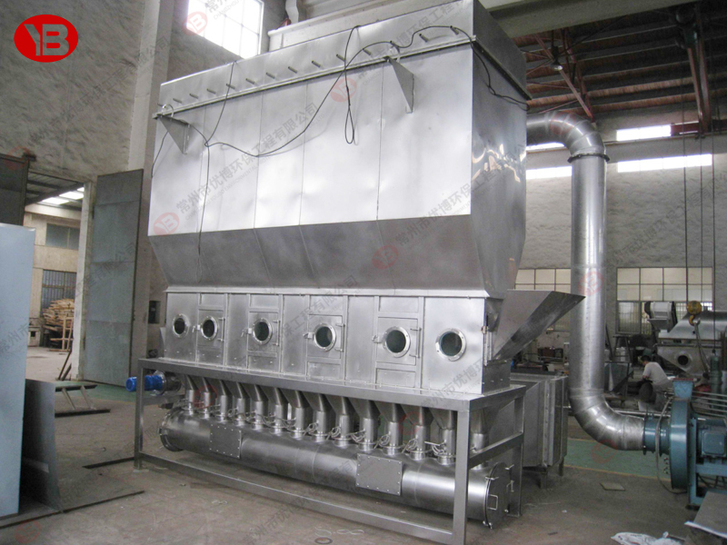 散粒狀固體物料由加料器加入流化床干燥器中,過濾后的潔凈空氣加熱后由鼓風(fēng)機送入流化床底部經(jīng)分布板與固體物料接觸,形成流態(tài)化達(dá)到氣固的熱質(zhì)交換。物料干燥后由排料口排出,廢氣由沸騰床頂部排出經(jīng)旋風(fēng)除塵器組和布袋除塵器回收固體粉料后排空。蒸汽、電、熱風(fēng)爐均可配用(按用戶要求配套)。