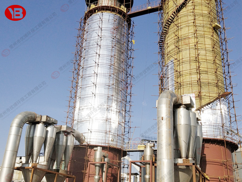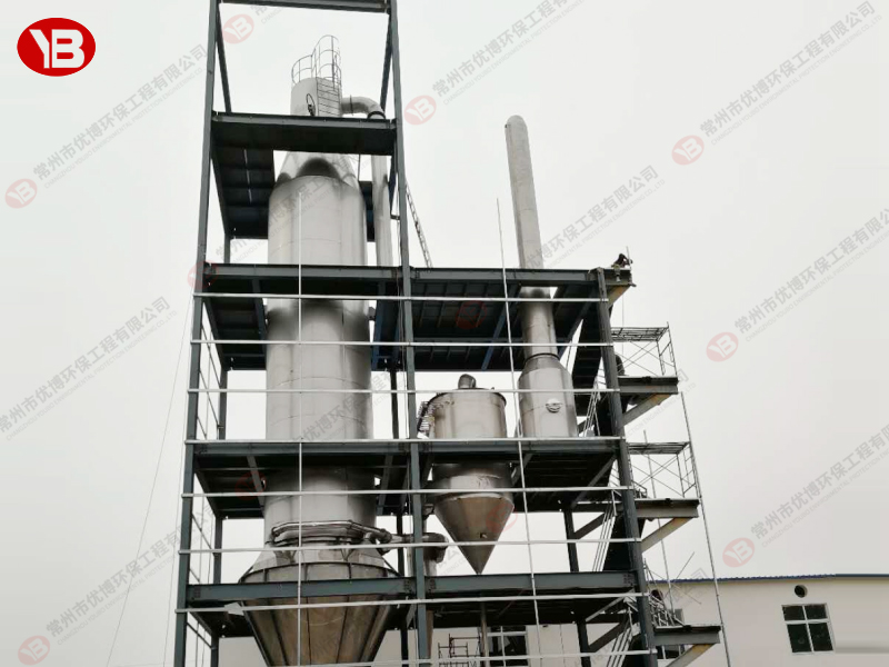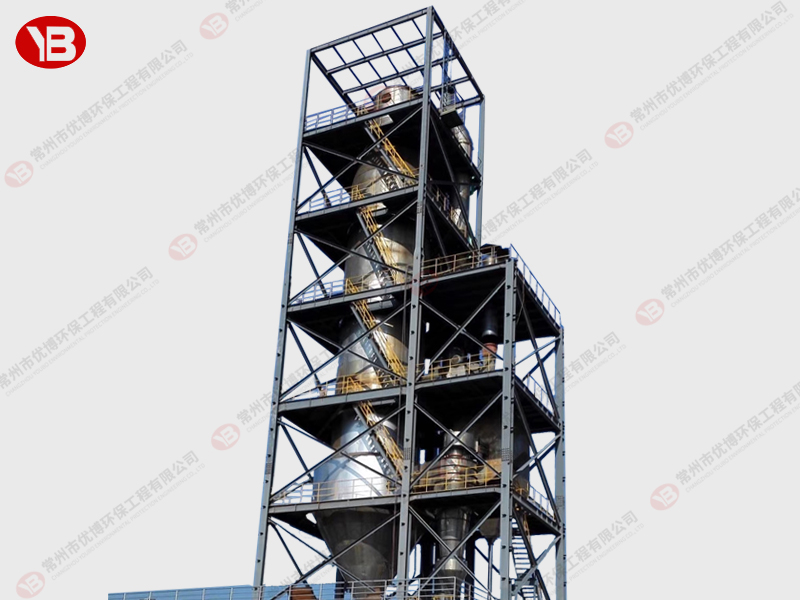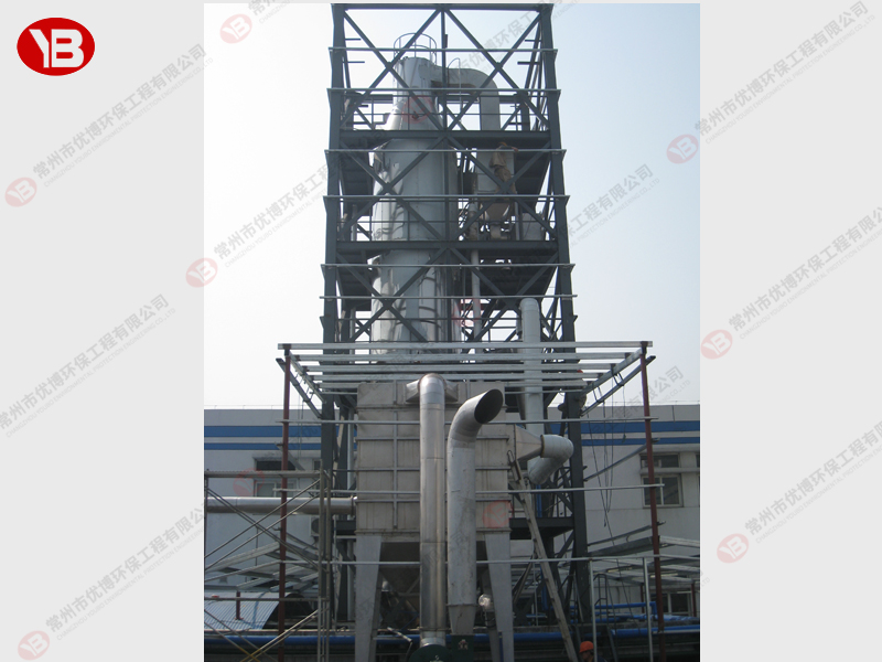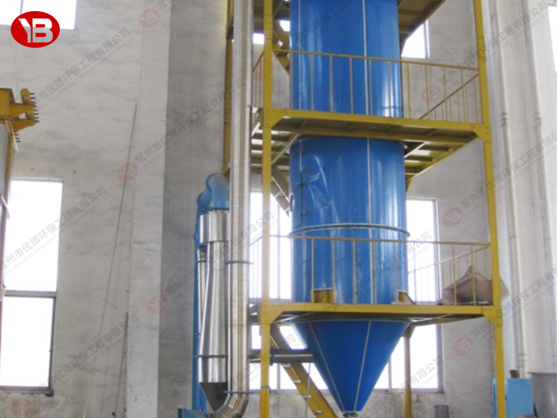 料液通過隔膜泵高壓輸入,噴出霧狀液滴,然后同熱空氣并流下降,大部分粉粒由塔底排料口收集,廢氣及其微小粉末經(jīng)旋風(fēng)分離器分離,廢氣由抽風(fēng)機排出,粉末由設(shè)在旋風(fēng)分離器下端的授粉筒收集,風(fēng)機出口還可裝備二級除塵裝置,回收率在96-98%以上。