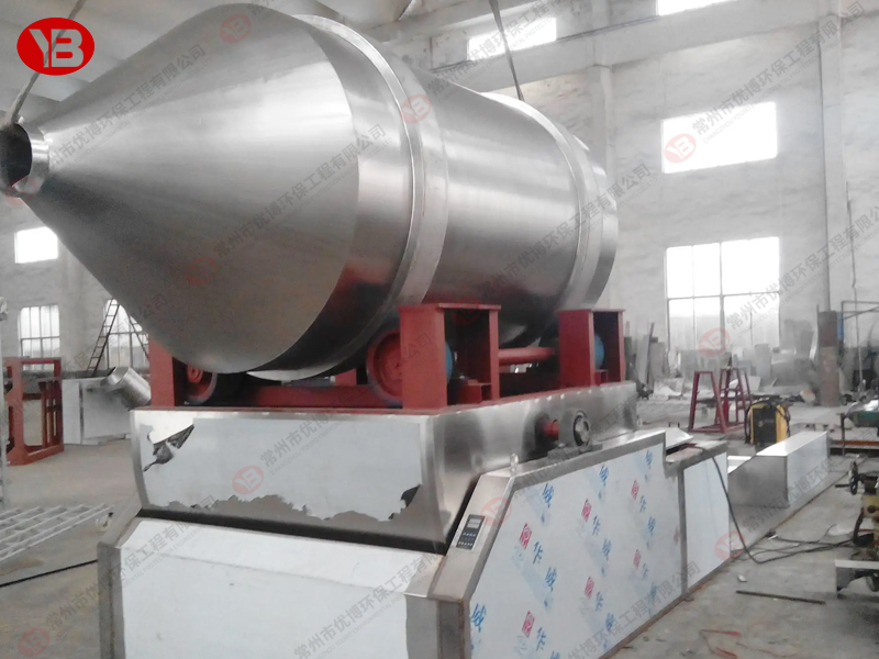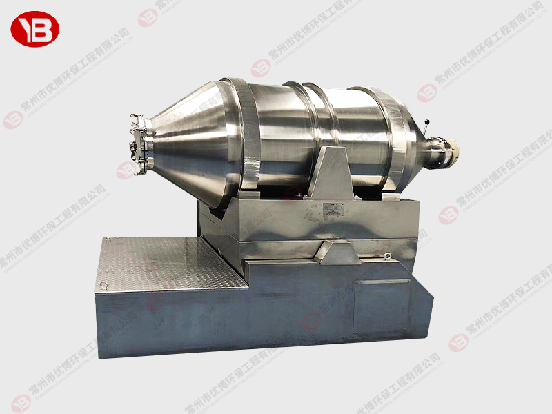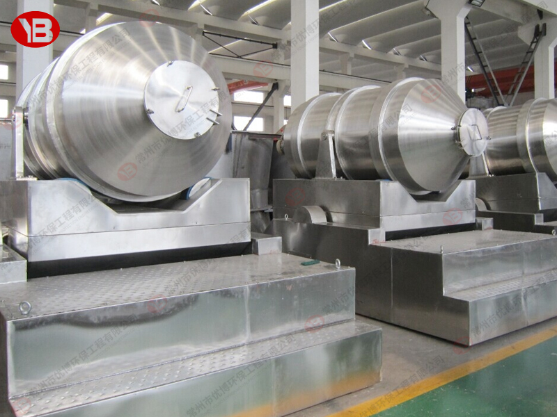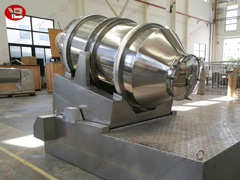 EYH系列二維運動混合機主要由轉(zhuǎn)筒、擺動架、機架三大部分構(gòu)成。轉(zhuǎn)筒裝在擺動架上,由四個滾輪支撐并由兩個擋輪對其進行軸向定位。在四個支撐滾輪中,其中兩個傳動輪由轉(zhuǎn)動動力系統(tǒng)拖動使轉(zhuǎn)筒產(chǎn)生轉(zhuǎn)動;擺動架由一組曲柄擺桿機構(gòu)來驅(qū)動,曲柄擺桿機構(gòu)裝在機架上,擺動架由軸承組件支撐在機架上。