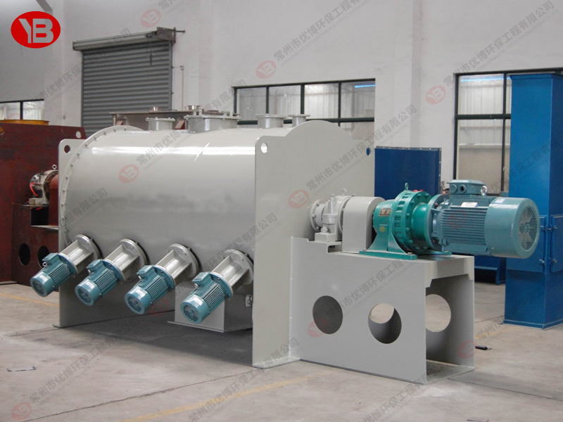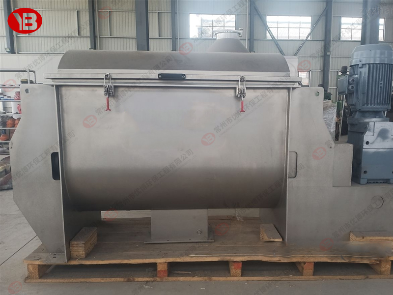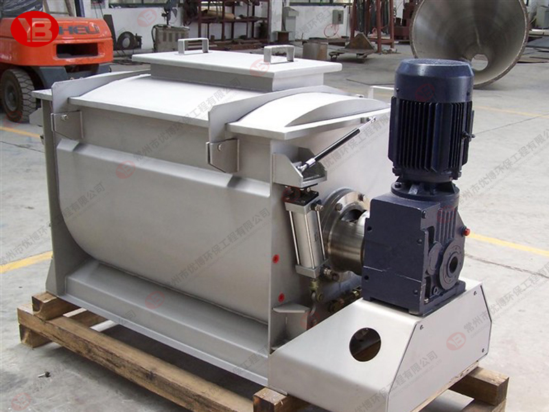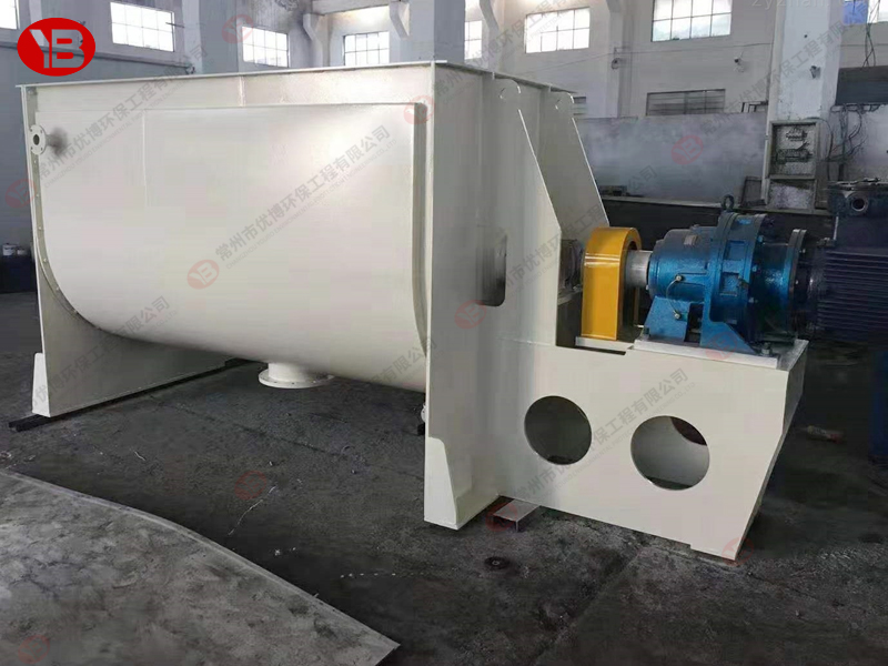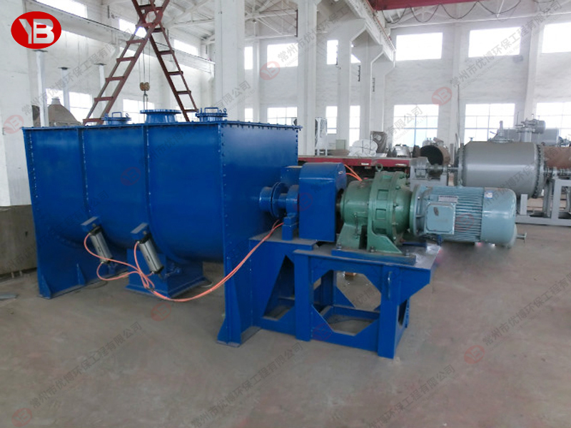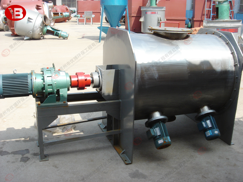 臥式螺帶混合機由安裝于攪拌軸上的內(nèi)外徑螺旋帶動桶體內(nèi)物料翻動,使攪拌器在桶體內(nèi)大范圍翻動物料。攪拌器結(jié)構(gòu)上,螺旋設(shè)計成內(nèi)外、左右互為反螺旋,攪拌器工作時內(nèi)螺旋帶動靠近軸心處物料做軸心旋轉(zhuǎn),軸向由內(nèi)至兩側(cè)推動,外螺旋帶動靠近筒壁物料做軸心旋轉(zhuǎn),軸向由兩側(cè)至內(nèi)推動,于是造成物料在筒體內(nèi)對流循環(huán)、剪切滲混,完成物料在較短時間內(nèi)快速均勻混合。